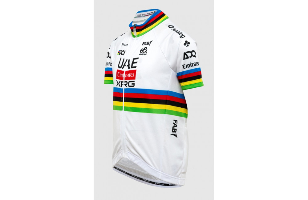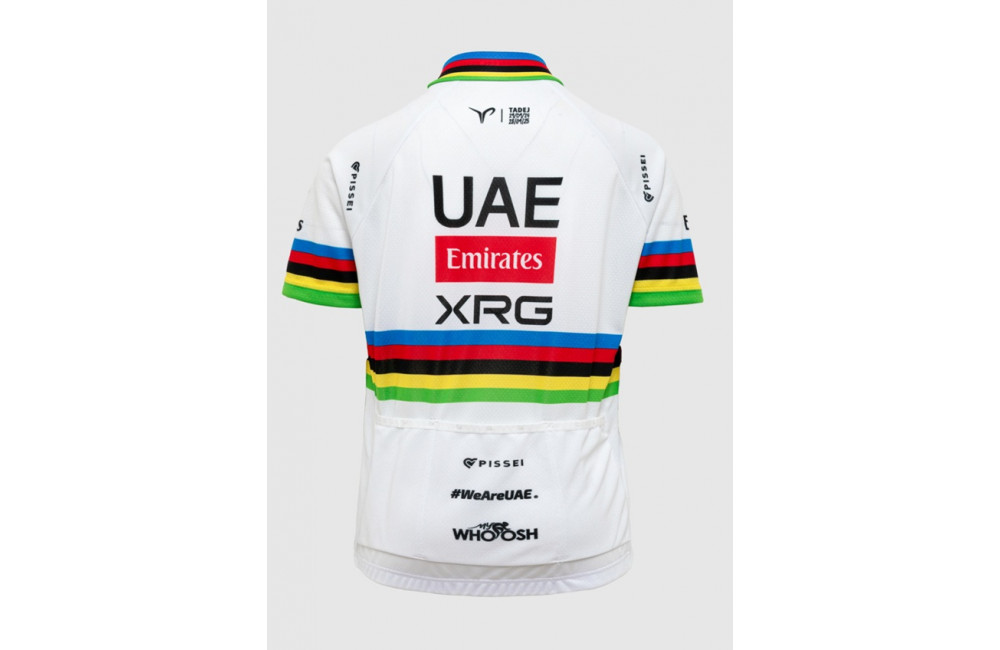 The UAE Team Emirates-XRG Tadej Pogačar 2026 World Champion kids' cycling jersey lets young cyclists proudly wear the official style of the WorldTour team.