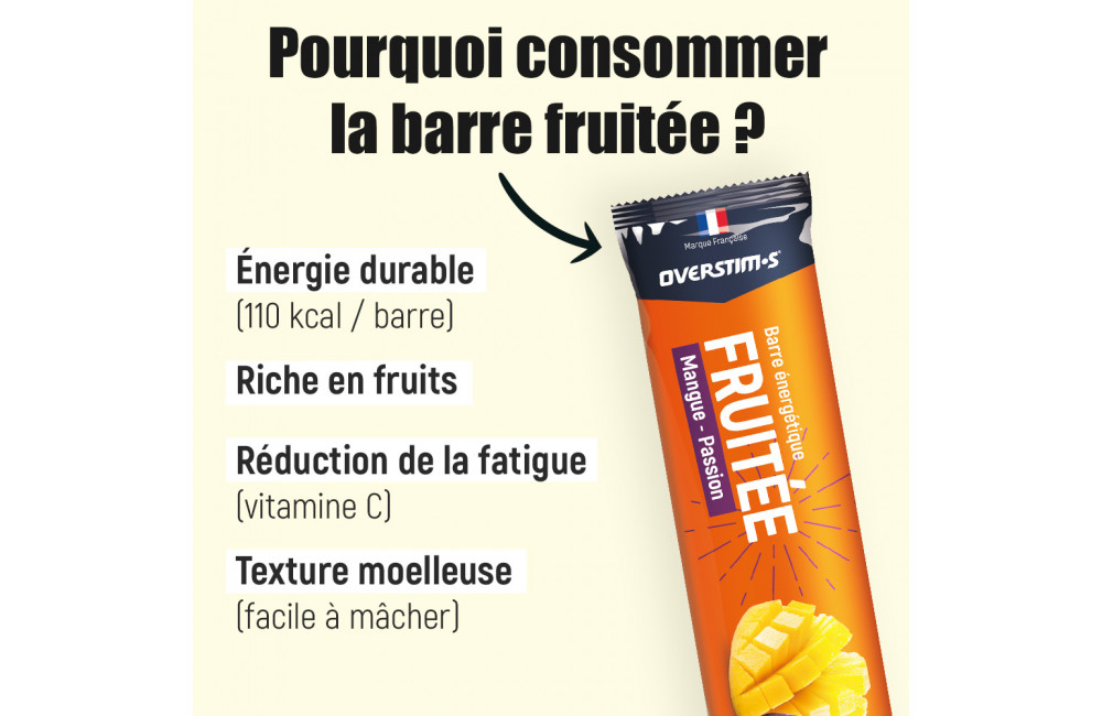 La barre fruitée complète l'action des boissons et gels énergétiques OVERSTIMS et se consomme, pendant l'effort, à intervalles réguliers par petites portions.
